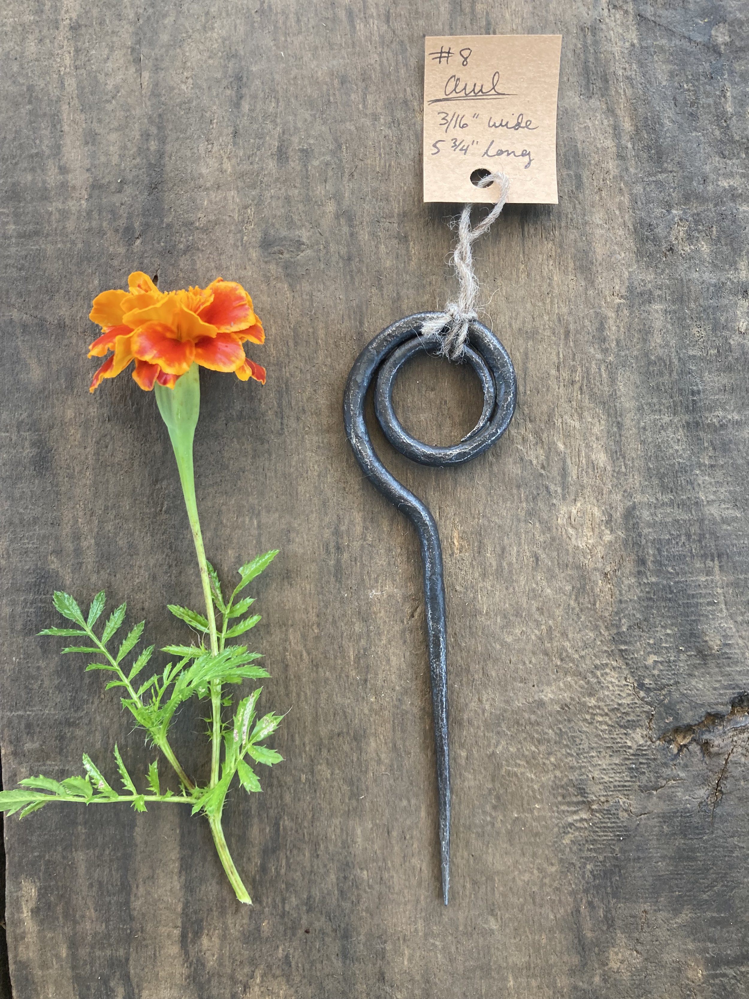 Each awl is hand forged and made in small batches. Scroll through to compare handle shapes and sizes. Each awl handle is designed with comfortability, weight, function and beauty in mind. The width measures the awl at its widest part of the taper before the handle starts, and the length measures the entire length of the tool from the top of the handle to the end tip. Actual measurements are typed under tool design #.